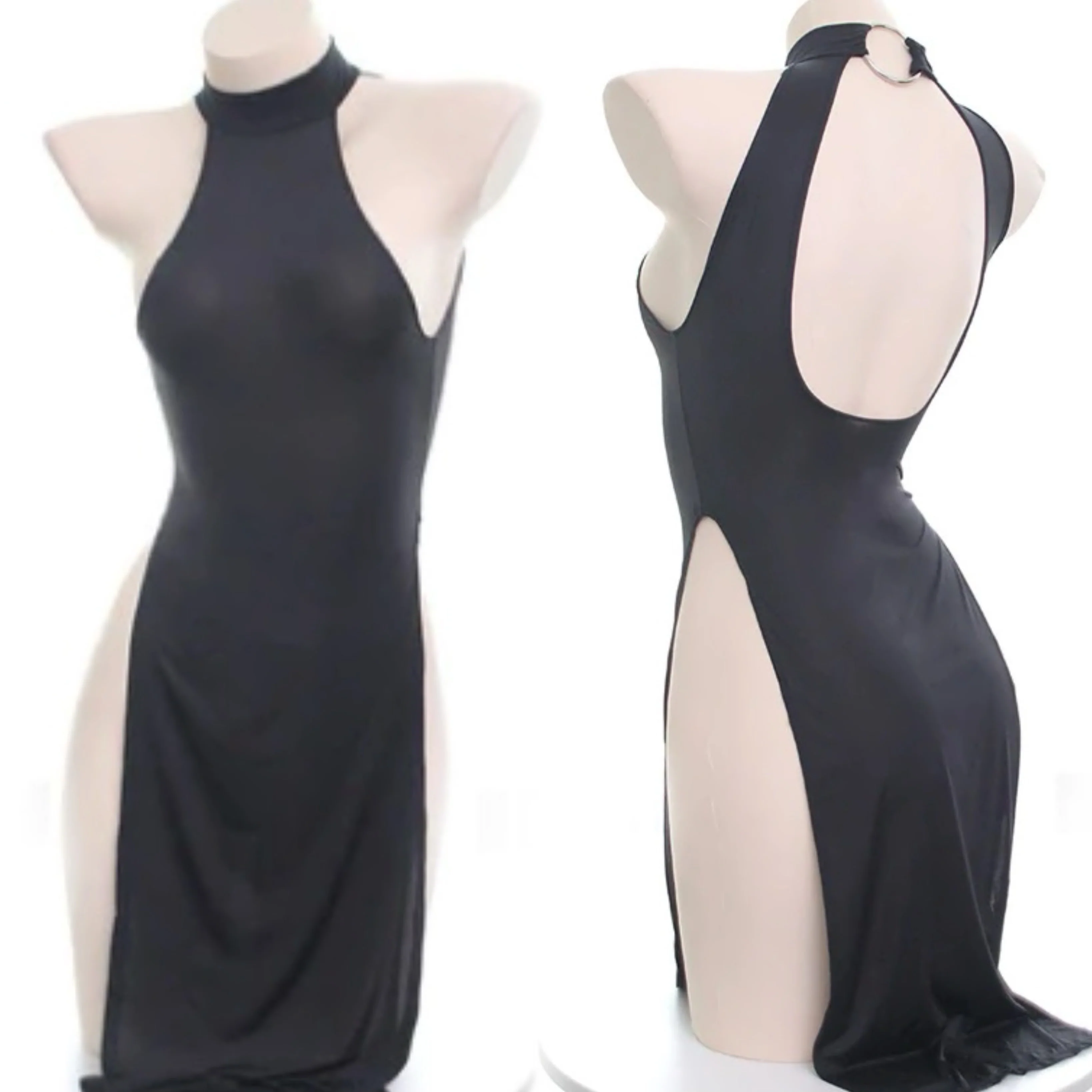 Low cut black suspender dress with slits HA1709 -
